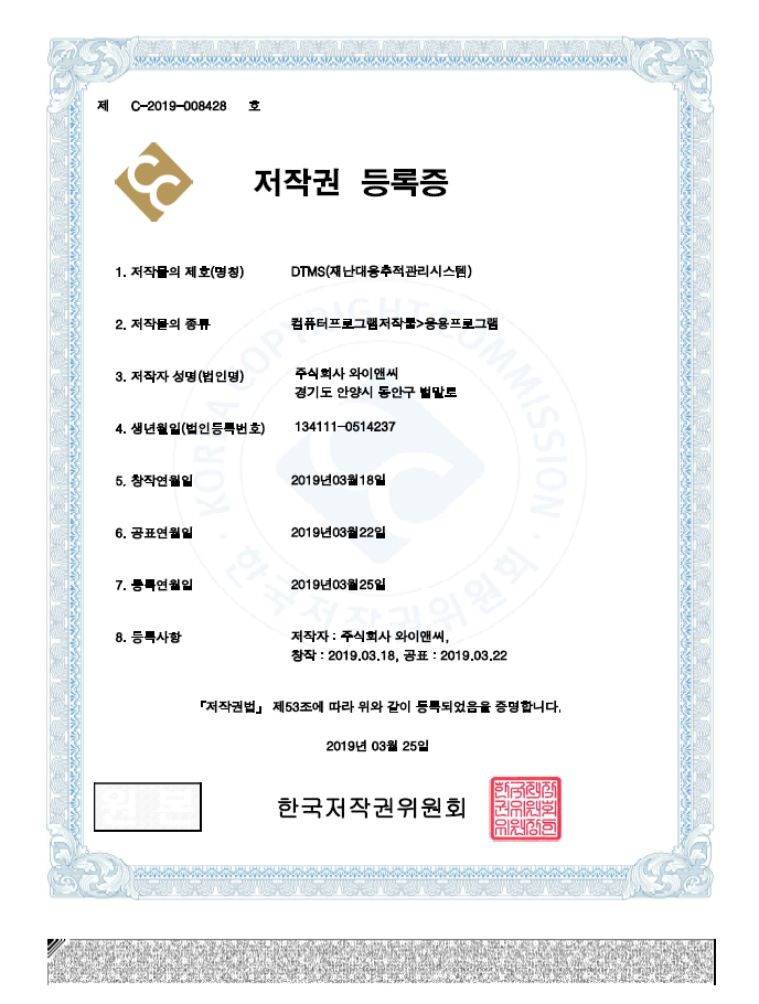 (주)와이앤씨는 25일 'DTMS(재닌대응추적관리시스템)'프로그램의 저작권 등록을 마쳤다.